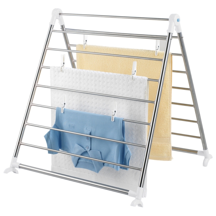 Der praktische, edelstahlummantelte Badewannen-Wäschetrockner Profi ist schnell und variabel zum Wäschetrocknen über der Wanne einsetzbar. Er verfügt über eine Gesamttrockenlänge von 11 m. Durch die stufenweise verstellbaren Trocknerflügel ist er flexibel einsetzbar. Komplett ausgeklappt kann er liegend über der Badewanne oder auch gegen die Wand gestellt verwendet werden. Als Dreieck geklappt kann er von beiden Seiten behängt werden. Trotz des geringen Gewichts ist der Wäschetrockner aufgrund seiner Spezial-Kunststoff-Füße standfest. Bei Nichtgebrauch kann er zusammenklappt werden und platzsparend verstaut.
