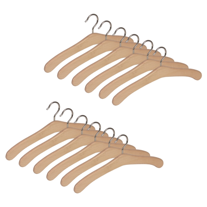 12er Garderobenbügel Set 1060 Premium natur n ✓ 12er Set ✓ aus Buchenholz, natur lackiert ✓ vernickelter Haken, drehbar ✓ ovale Form, abgerundete Enden ✓ die Auflagenbreite beträgt 15 mm ✓ die Hakenöffnung beträgt 42 mm ✓ die Gesamthöhe des Bügel beträgt 19 cm ✓ der Garderobenbügel hat eine Breite von 45 cm ✓ geeignet für Mäntel, Jacken, Oberbekleidung