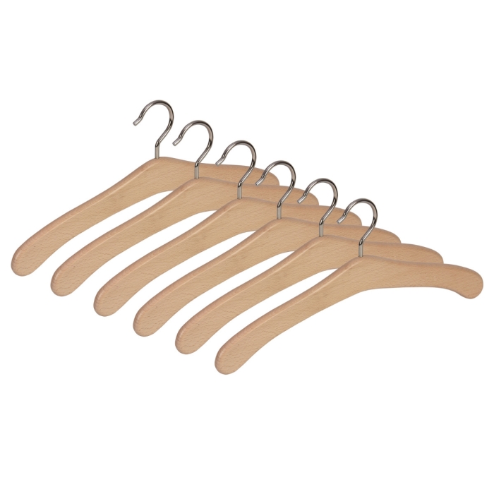 6er Garderobenbügel Set 1060 Premium natur n ✓ 6er Set ✓ aus Buchenholz, natur lackiert ✓ vernickelter Haken, drehbar ✓ ovale Form, abgerundete Enden ✓ die Auflagenbreite beträgt 15 mm ✓ die Hakenöffnung beträgt 42 mm ✓ die Gesamthöhe des Bügel beträgt 19 cm ✓ der Garderobenbügel hat eine Breite von 45 cm ✓ geeignet für Mäntel, Jacken, Oberbekleidung