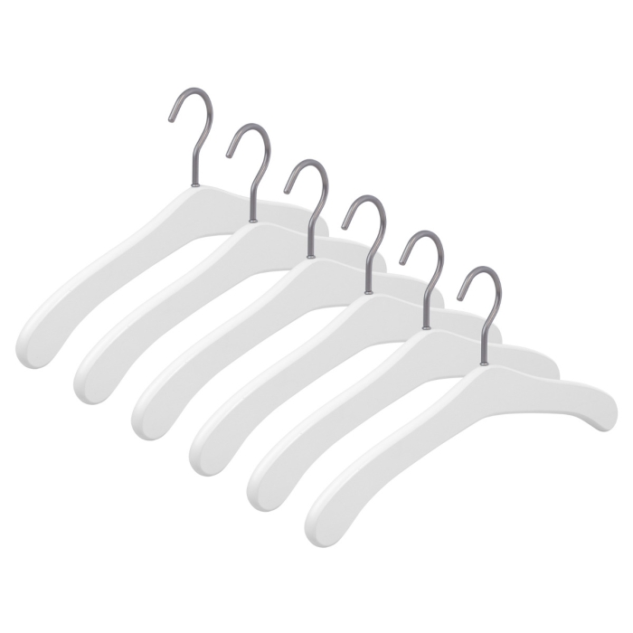 6er Garderobenbügel Set 1060 Premium weiß sl ✓ 6er Set ✓ aus Buchenholz, weiß lackiert ✓ 6 mm Haken, silber matt lackiert ✓ ovale Form, abgerundete Enden ✓ die Auflagenbreite beträgt 15 mm ✓ die Hakenöffnung beträgt 42 mm ✓ die Gesamthöhe des Bügel beträgt 19 cm ✓ der Garderobenbügel hat eine Breite von 45 cm ✓ geeignet für Mäntel, Jacken, Oberbekleidung