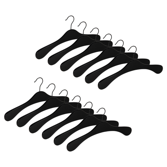 12er Garderobenbügel Set ECO 1112 Premium schwarz s ✓ 12er Set ✓ aus Buchenholz gefertigt ✓ in geschwungener Form ✓ schwarzer 3,4 mm Haken, drehbar ✓ die Auflagenbreite beträgt 10 mm ✓ die Hakenöffnung beträgt 42 mm ✓ in der Farbe schwarz hochglänzend lackiert ✓ der Garderobenbügel hat eine Breite von 41 cm ✓ geeignet für Mäntel, Jacken, Oberbekleidung