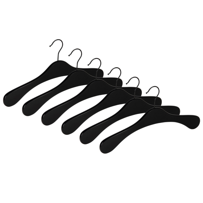 6er Garderobenbügel Set ECO 1112 Premium schwarz s ✓ 6er Set ✓ aus Buchenholz gefertigt ✓ in geschwungener Form ✓ schwarzer 3,4 mm Haken, drehbar ✓ die Auflagenbreite beträgt 10 mm ✓ die Hakenöffnung beträgt 42 mm ✓ in der Farbe schwarz hochglänzend lackiert ✓ der Garderobenbügel hat eine Breite von 41 cm ✓ geeignet für Mäntel, Jacken, Oberbekleidung