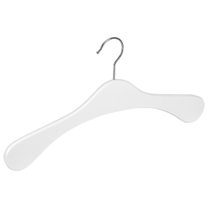 Garderobenbügel 1112 weiß n ✓ aus Buchenholz gefertigt ✓ in geschwungener Form ✓ vernickelter 3,4 mm Haken, drehbar ✓ die Auflagenbreite beträgt 10 mm ✓ die Hakenöffnung beträgt 42 mm ✓ in der Farbe weiß hochglänzend lackiert ✓ der Garderobenbügel hat eine Breite von 41 cm ✓ geeignet für Mäntel, Jacken, Oberbekleidung