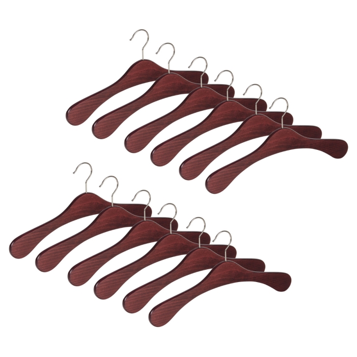 12er Garderobenbügel Set ECO 1112 Premium mahagoni n ✓ 12er Set ✓ aus Buchenholz gefertigt ✓ in geschwungener Form ✓ vernickelter 3,4 mm Haken, drehbar ✓ in der Farbe mahagoni gebeizt ✓ die Auflagenbreite beträgt 10 mm ✓ die Hakenöffnung beträgt 42 mm ✓ der Garderobenbügel hat eine Breite von 41 cm ✓ geeignet für Mäntel, Jacken, Oberbekleidung