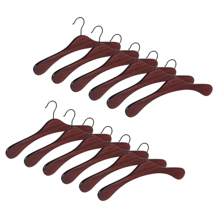 12er Garderobenbügel Set ECO 1112 Premium mahagoni s ✓ 12er Set ✓ aus Buchenholz gefertigt ✓ in geschwungener Form ✓ schwarzer 3,4 mm Haken, drehbar ✓ in der Farbe mahagoni gebeizt ✓ die Auflagenbreite beträgt 10 mm ✓ die Hakenöffnung beträgt 42 mm ✓ der Garderobenbügel hat eine Breite von 41 cm ✓ geeignet für Mäntel, Jacken, Oberbekleidung