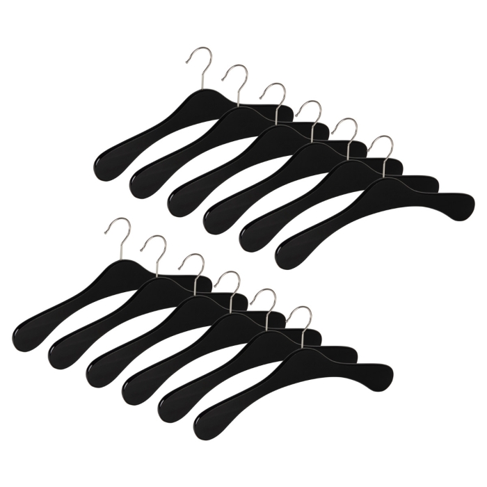 12er Garderobenbügel Set ECO 1112 Premium schwarz n ✓ 12er Set ✓ aus Buchenholz gefertigt ✓ in geschwungener Form ✓ 3,4 mm vernickelter Haken, drehbar ✓ die Auflagenbreite beträgt 10 mm ✓ die Hakenöffnung beträgt 42 mm ✓ in der Farbe schwarz hochglänzend lackiert ✓ der Garderobenbügel hat eine Breite von 41 cm ✓ geeignet für Mäntel, Jacken, Oberbekleidung
