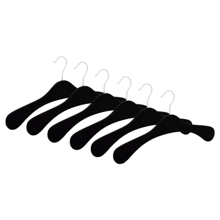 6er Garderobenbügel Set ECO 1112 schwarz w ✓ 6er Set ✓ aus Buchenholz gefertigt ✓ in geschwungener Form ✓ 3,4 mm Haken, drehbar in Farbe weiss ✓ die Auflagenbreite beträgt 10 mm ✓ die Hakenöffnung beträgt 42 mm ✓ in der Farbe schwarz hochglänzend lackiert ✓ der Garderobenbügel hat eine Breite von 41 cm ✓ geeignet für Mäntel, Jacken, Oberbekleidung