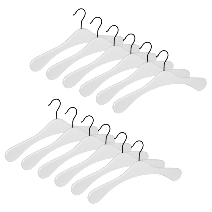 12er Garderobenbügel Set ECO 1112 Premium weiß s ✓ 12er Set ✓ aus Buchenholz gefertigt ✓ in geschwungener Form ✓ schwarzer 3,4 mm Haken, drehbar ✓ die Auflagenbreite beträgt 10 mm ✓ die Hakenöffnung beträgt 42 mm ✓ in der Farbe weiß hochglänzend lackiert ✓ der Garderobenbügel hat eine Breite von 41 cm ✓ geeignet für Mäntel, Jacken, Oberbekleidung