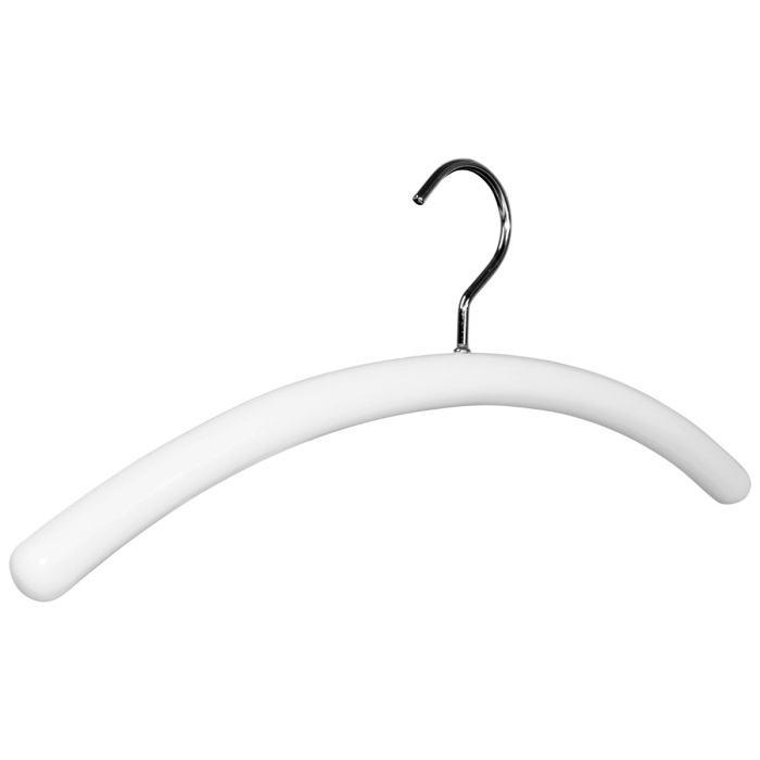 Der Garderobenbügel 502 Premium in strahlendem Weiß und mit vernickeltem Haken ist eine Zusammenkunft von Eleganz und Funktionalität.