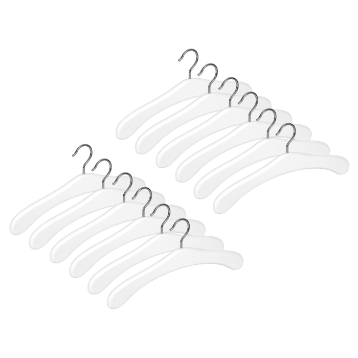 12er Garderobenbügel Set 506 Premium weiß n ✓ 12er Set ✓ aus Buchenholz gefertigt ✓ vernickelter Haken, drehbar ✓ in der Farbe weiß lackiert ✓ die Auflagenbreite beträgt 18 mm ✓ die Hakenöffnung beträgt 42 mm ✓ der Garderobenbügel hat eine Breite von 45 cm ✓ ovale und flache Form, abgerundete Enden ✓ geeignet für Mäntel, Jacken, Oberbekleidung ✓ die Gesamthöhe des Bügels beträgt 20 cm