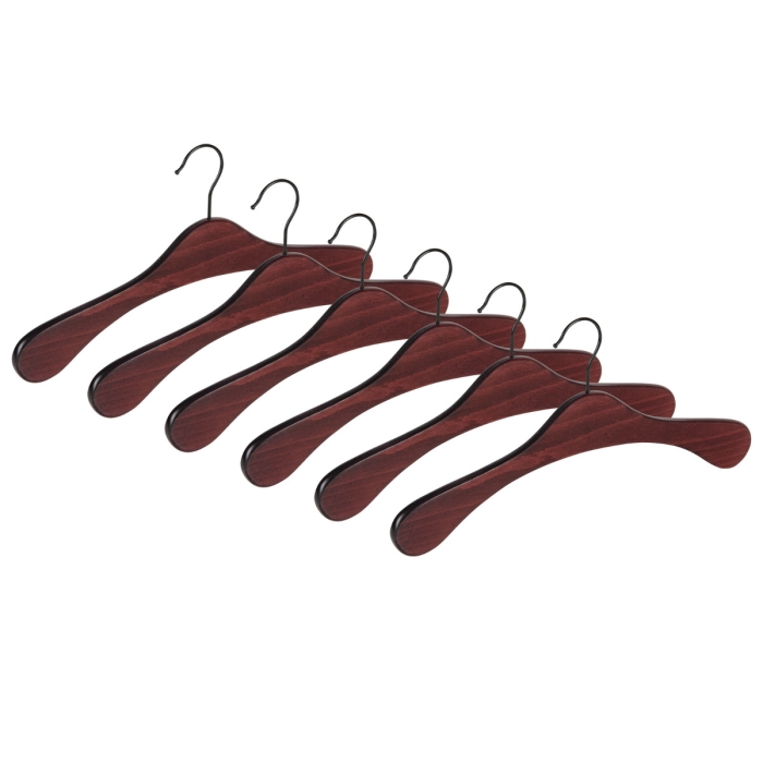 6er Garderobenbügel Set ECO 1112 Premium mahagoni s ✓ 6er Set ✓ aus Buchenholz gefertigt ✓ in geschwungener Form ✓ schwarzer 3,4 mm Haken, drehbar ✓ in der Farbe mahagoni gebeizt ✓ die Auflagenbreite beträgt 10 mm ✓ die Hakenöffnung beträgt 42 mm ✓ der Garderobenbügel hat eine Breite von 41 cm ✓ geeignet für Mäntel, Jacken, Oberbekleidung