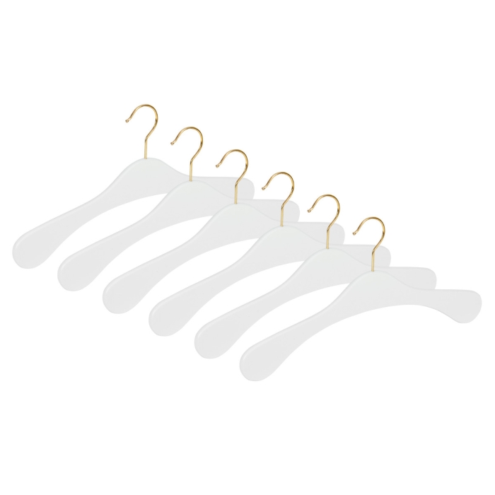 6er Garderobenbügel Set ECO 1112 Premium weiß ✓ 6er Set ✓ aus Buchenholz gefertigt ✓ in geschwungener Form ✓ vermessingter 3,4 mm Haken, drehbar ✓ die Auflagenbreite beträgt 10 mm ✓ die Hakenöffnung beträgt 42 mm ✓ in der Farbe weiß hochglänzend lackiert ✓ der Garderobenbügel hat eine Breite von 41 cm ✓ geeignet für Mäntel, Jacken, Oberbekleidung
