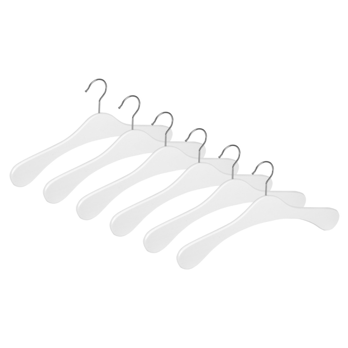 6er Garderobenbügel Set ECO 1112 Premium weiß n ✓ 6er Set ✓ aus Buchenholz gefertigt ✓ in geschwungener Form ✓ vernickelter 3,4 mm Haken, drehbar ✓ die Auflagenbreite beträgt 10 mm ✓ die Hakenöffnung beträgt 42 mm ✓ in der Farbe weiß hochglänzend lackiert ✓ der Garderobenbügel hat eine Breite von 41 cm ✓ geeignet für Mäntel, Jacken, Oberbekleidung