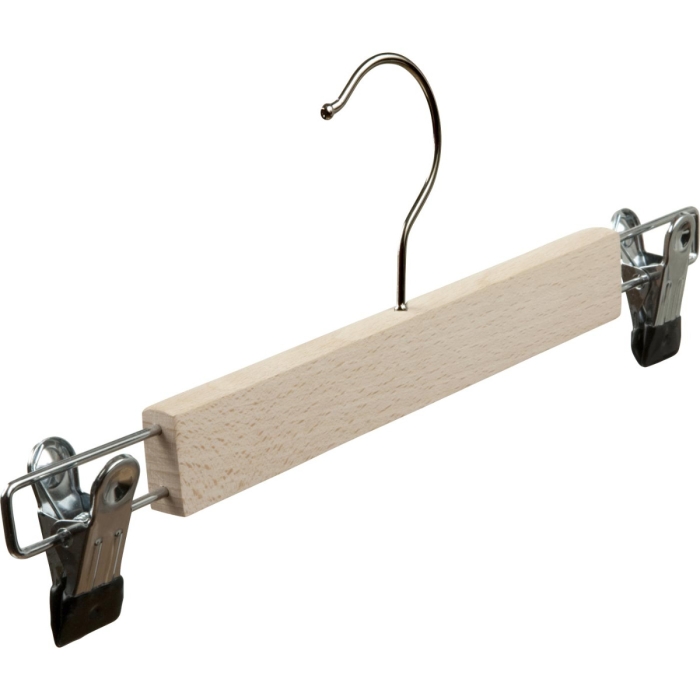 Hosenbügel 1619 ✓ Hosen- und Rockhalter aus Buchenholz ✓ Hosenhalter natur lackiert ✓ die Leistenhöhe beträgt 3 cm ✓ mit vernickelten Metallteilen ✓ Clipsteg in in Holz eingefasst und 2 Klammern ✓ erhältlich in den Breiten: 33 cm und 26 cm ✓ der Hosenbügel hat eine Auflagebreite von 12 mm ✓ seitlich angebrachte Klammern auf Doppelträger ✓ Abmessung Holzeinfassung: 215x30x12 mm