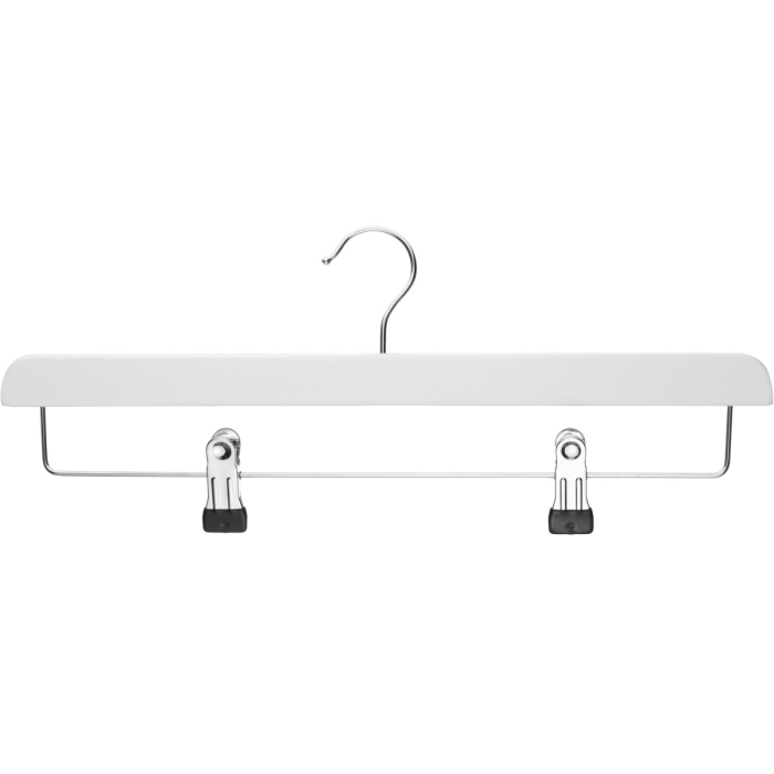 Hosenbügel C 1908 W ✓ vernickelter Haken, drehbar ✓ mit vernickelten Metallteilen ✓ Hosenbügel mit Klammersteg ✓ die Auflagebreite beträgt 12 mm ✓ erhältlich in einer Breite von 40 cm ✓ Hosen- und Rockhalter aus Lotusholz ✓ in weiß oder schwarz lackiert erhältlich ✓ Clipsteg in Holz eingefasst und 2 Klammern