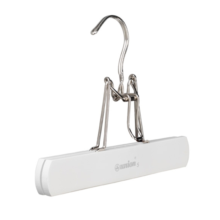 Hosenklemmbügel pieperconcept Union 5 weiß ✓ Hosenklemmbügel aus Buchenholz ✓ die Hakenöffnung beträgt 46 mm ✓ geeignet für Hosen und Röcke aller Art ✓ die Bügelbreite beträgt in 26 cm ✓ die Höhe der Holzleisten beträgt 40 mm ✓ Haken und Gestell silberfarbig glänzend ✓ Qualitätsprodukt aus dem Hause Union ✓ mit Filzeinlagen zwischen den Klemmleisten ✓ das Gewicht des Kleiderbügels beträgt ca. 190g