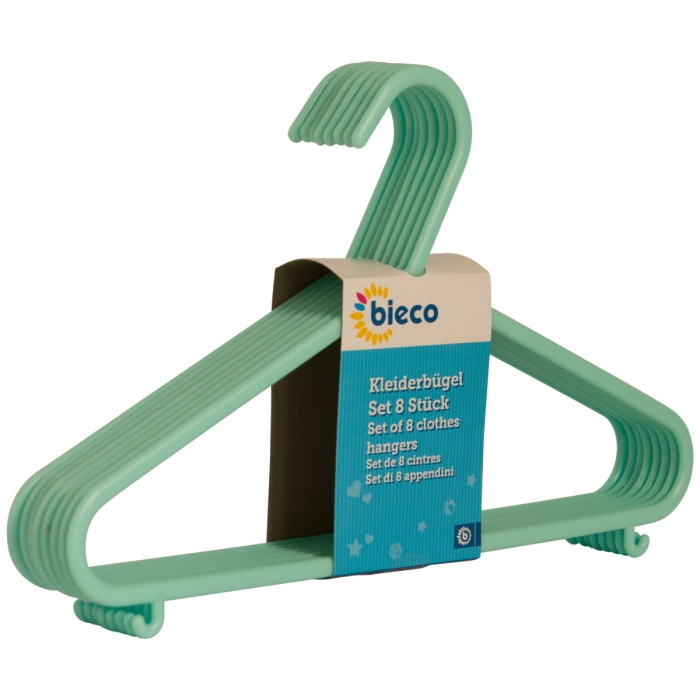 Kinder Kleiderbügel bieco 8er Set türkis - 8er Set - mit Rockhaken - aus hochwertigem Kunststoff - die Auflagenbreite beträgt 10 mm - die Kleiderbügelbreite beträgt 30 cm - Sie erhalten acht Kleiderbügel im Set