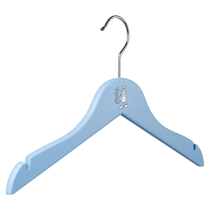 Kinder Kleiderbügel BORN blau ✓ Massivholz in der Farbe blau ✓ 3,4 mm Haken silberfarbig ✓ aus Buchenholz gefertigt ✓ der Haken ist 360° drehbar ✓ platzsparender Flachbügel ✓ die Auflagebreite beträgt 12 mm ✓ mit Motivdruck auf dem Bügelkopf ✓ in der Bügelbreite von 34 cm erhältlich ✓ mit zwei Rockeinkerbungen an den Seiten