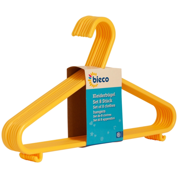 Kinder Kleiderbügel bieco 8er Set gelb - 8er Set - mit Rockhaken - aus hochwertigem Kunststoff - die Auflagenbreite beträgt 10 mm - die Kleiderbügelbreite beträgt 30 cm - Sie erhalten acht Kleiderbügel im Set