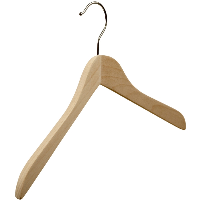 Kleiderbügel 129 ✓ Buchenholz natur lackiert ✓ vernickelter Kugelhaken ✓ der Haken ist drehbar ✓ Kleiderbügel mit runder Kopfform ✓ gewinkelte Kleiderbügelform ✓ die Auflagebreite beträgt 13 mm ✓ erhältlich in der Größe 44 cm