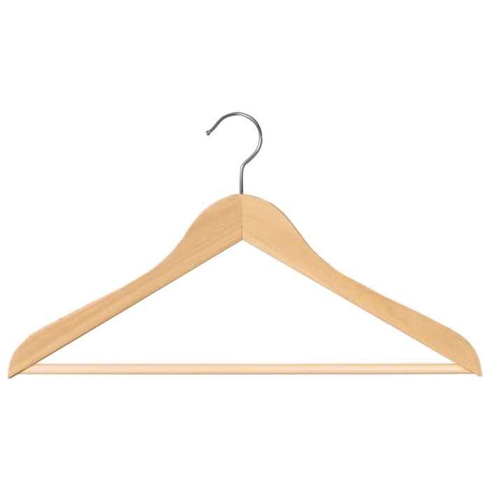 Kleiderbügel 139 ✓ Buchenholz natur lackiert ✓ gewinkelte Kleiderbügelform ✓ Kleiderbügel mit Hosensteg ✓ die Auflagebreite beträgt 13 mm ✓ Kleiderbügel mit runder Kopfform ✓ vernickelter Kugelhaken, drehbar ✓ erhältlich in der Größe 38 cm