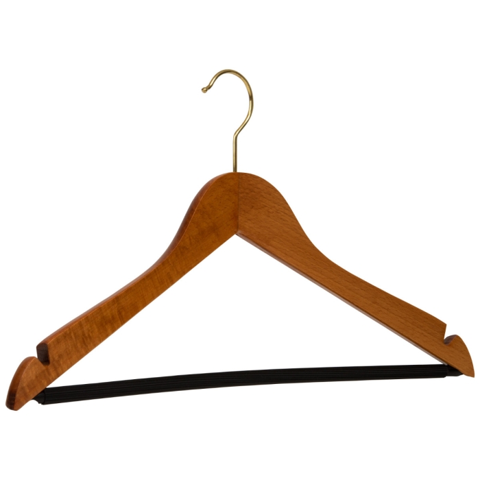 Kleiderbügel 139 HR kirsch ✓ aus Buchenholz gefertigt ✓ in der Farbe kirsche gebeizt ✓ Kugelhaken messingfarben, drehbar ✓ erhältlich in einer Breite von 44 cm ✓ die Auflagebreite beträgt 13 mm ✓ mit Hosensteg, rutschfest ummantelt ✓ mit Rockeinkerbungen an den Seiten