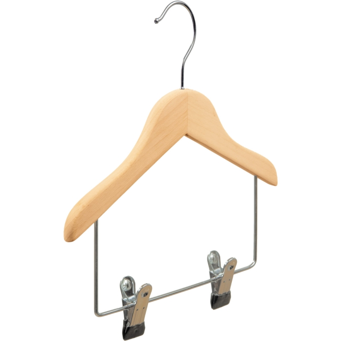 Kinderkleiderbügel 147 C 10 ✓ vernickelter Kugelhaken, drehbar ✓ mit vernickeltem Clipsteg, Höhe 9-10 cm ✓ Flachbügel aus Buchenholz natur lackiert ✓ erhältlich in der Breite 32,5 cm ✓ der Kinderbügel hat eine Auflagebreite von 12 mm