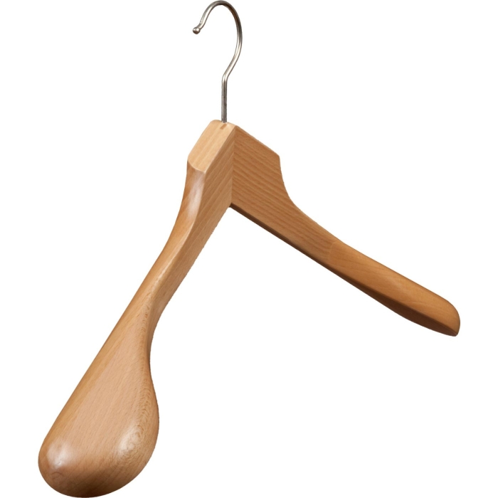 Kleiderbügel 247 ✓ Buchenholz natur lackiert ✓ Schulterbügel aus Buchenholz ✓ vernickelter Kugelhaken, drehbar ✓ Schulterverbreiterung von 60 mm ✓ Formbügel mit verbreiteter Schulterauflage ✓ erhältlich in der Breite 50 cm