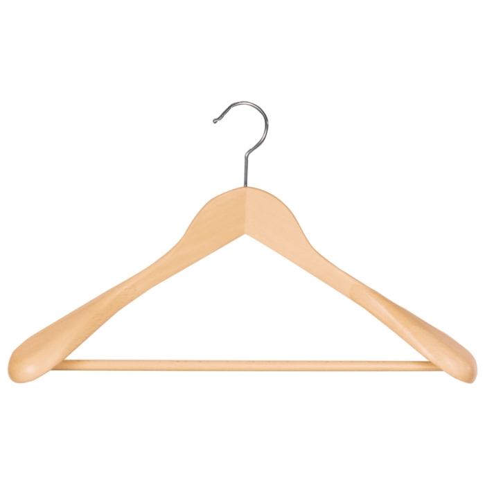 Kleiderbügel 256 ✓ in der Farbe Buche natur lackiert ✓ Komfort-Formbügel aus Massivholz ✓ der Kleiderbügel ist körpergeformt ✓ Schulterverbreiterung: 60 mm ✓ drehbarer vernickelter Haken ✓ verbreiterte Schulterenden mit Hosensteg ✓ erhältlich in der Größe 44 cm ✓ die Gesamthöhe des Bügels beträgt 25 cm