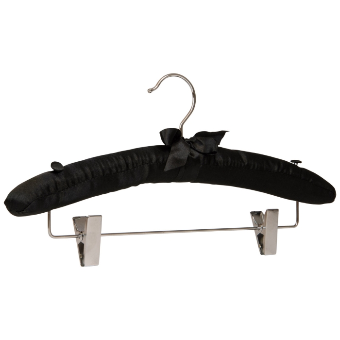 Kleiderbügel 514 CBS Satinbezug ✓ Kleiderbügel mit Satinbezug ✓ Satinbezug in Farbe schwarz ✓ die Bügelbreite beträgt 38 cm ✓ drehbarer Haken, vernickeltet ✓ die Auflagebreite beträgt 35 mm ✓ Schaumstoff gepolstert mit Schleife ✓ mit Clipsteg vernickelt und Knöpfen