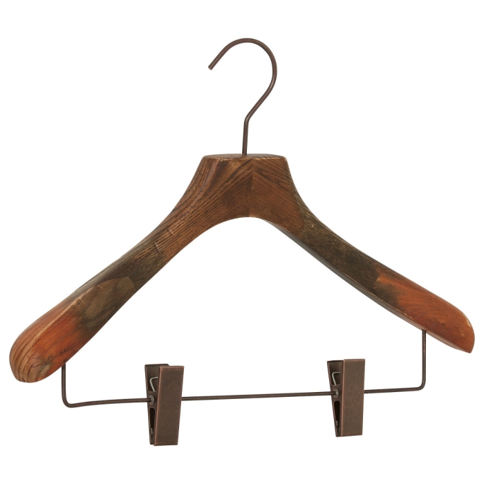 Kleiderbügel 7280nk Vintage Premium ✓ Premium Vintage Kleiderbügel ✓ die Bügelbreite beträgt 41 cm ✓ die Auflagenbreite beträgt 40 mm ✓ einzigartiges Vintage Design ✓ Haken "old copper" in 4 mm Stärke ✓ die Hakenöffnung beträgt 46 mm ✓ aus hochwertigem Eschenholz ✓ gebogen Kleiderbügelform ✓ Klammernsteg mit zwei Clips in "old copper" ✓ die Gesamthöhe des Bügels beträgt 30 cm