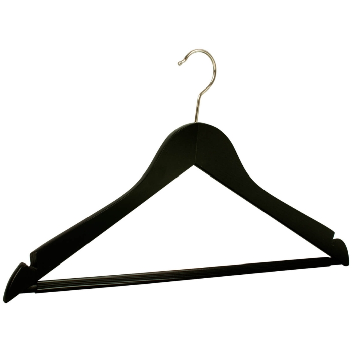 Kleiderbügel Business RE RFS schwarz ✓ der Kleiderbügel ist körpergeformt ✓ in der Farbe schwarz lackiert ✓ drehbarer 3,4 mm Haken, vernickelt ✓ ungebrochene Kantenausführung ✓ die Auflagenbreite beträgt 12 mm ✓ die Hakenöffnung beträgt ca. 40 mm ✓ die Kleiderbügelbreite beträgt 45 cm ✓ mit Holzsteg, rutschfest ummantelt ✓ mit Rockeinkerbungen an den Seiten ✓ der Kleiderbügel hat ein Gewicht von ca. 170 g
