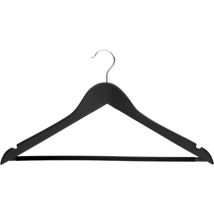 Kleiderbügel C 139 HRS ✓ Lotusholz in schwarz lackiert ✓ Formbügel aus leichtem Lotusholz ✓ auch in weiß lackiert lieferbar ✓ vernickelter Kugelhaken, drehbar ✓ erhältlich in einer Breite von 44 cm ✓ der Kleiderbügel hat eine Auflagebreite von 12 mm ✓ mit rutschfester Stegummantelung und Rockkerben