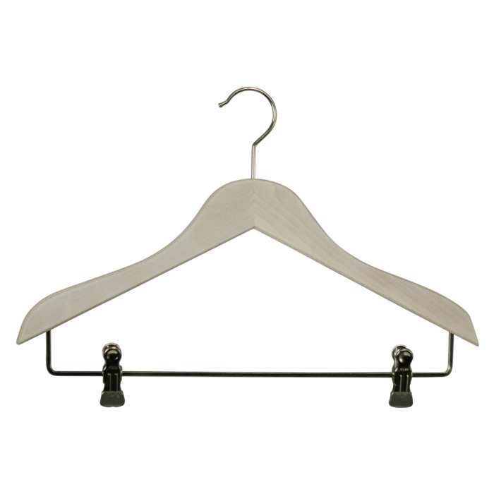 Kleiderbügel Classic K weiss ✓ aus Buchenholz gefertigt ✓ in der Farbe weiß gewaschen ✓ drehbarer 3,4 mm Haken, vernickelt ✓ die Hakenöffnung beträgt 40 mm ✓ die Auflagenbreite beträgt 12 mm ✓ die Kleiderbügelbreite beträgt 41 cm ✓ flache platzsparende Kleiderbügelform ✓ plangeformt, ungebrochene Kantenausführung ✓ Kombi-Flachbügel mit Klammerngestell ✓ mit zwei verschiebbaren, rutschhemmend ummantelten Clips