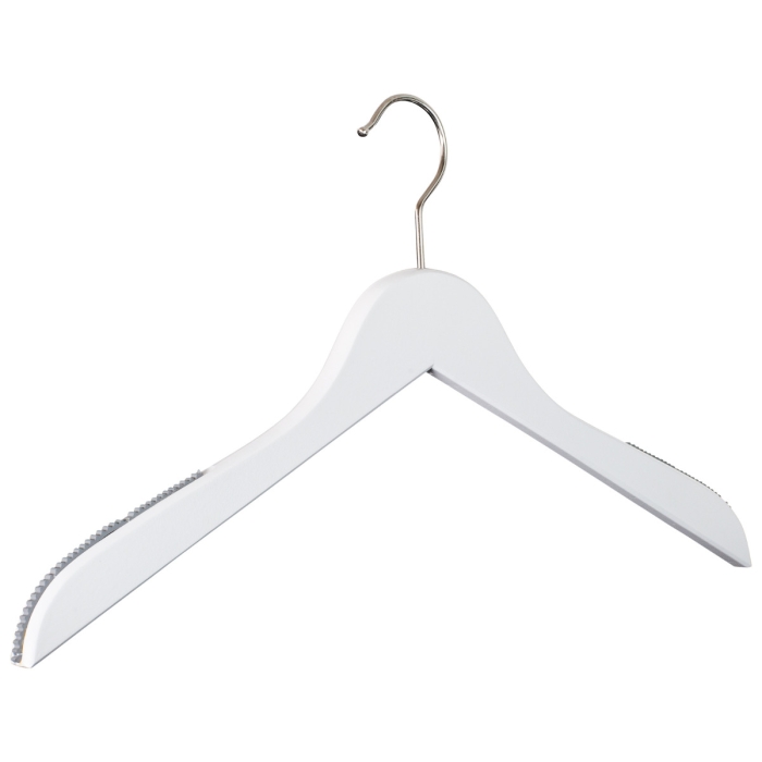 Kleiderbügel ECO 4400 weiß ✓ in der Farbe weiß lackiert ✓ vernickelter 3,4 mm Kugelhaken ✓ aus Buchenholz gefertigt ✓ mit eingelassenen Rippeinlagen ✓ rutschhemmender Schulterbereich ✓ die Auflagenbreite beträgt 13 mm ✓ die Kleiderbügelbreite beträgt 44 cm ✓ das Gewicht je Bügel beträgt ca. 125 g ✓ flache platzsparende Kleiderbügelform