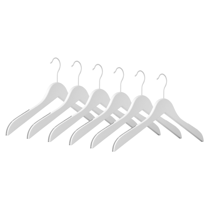 6er Kleiderbügel Set ECO 4400 weiß w ✓ 6er Set ✓ in der Farbe weiß lackiert ✓ aus Buchenholz gefertigt ✓ mit eingelassenen Rippeinlagen ✓ rutschhemmender Schulterbereich ✓ die Auflagenbreite beträgt 13 mm ✓ 3,4 mm Kugelhaken in Farbe weiss ✓ die Kleiderbügelbreite beträgt 44 cm ✓ das Gewicht je Bügel beträgt ca. 125 g ✓ flache platzsparende Kleiderbügelform