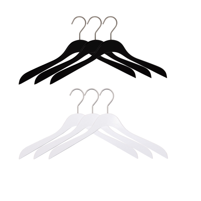 Kleiderbügel ECO 6600 schwarz weiss 6er Set ✓ sechs Kleiderbügel im Set ✓ je drei Stück in weiß und schwarz lackiert ✓ aus Buchenholz gefertigt ✓ die Hakenöffnung beträgt 40 mm ✓ Hakenfarbe silber matt, drehbar ✓ die Auflagenbreite beträgt 13 mm ✓ flache platzsparende Kleiderbügelform ✓ die Kleiderbügelbreite beträgt 44,5 cm