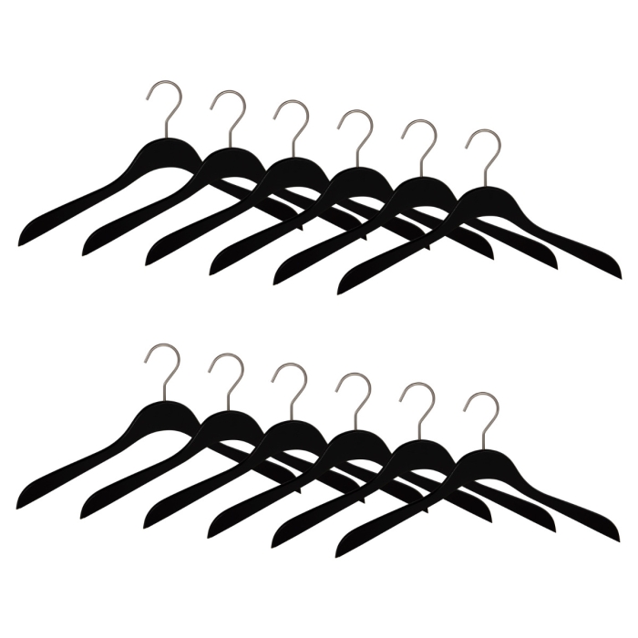 12er Kleiderbügel Set ECO 6600 schwarz n ✓ 12er Set ✓ in der Farbe schwarz lackiert ✓ aus Buchenholz gefertigt ✓ Haken 4 mm matt vernickelt, drehbar ✓ die Hakenöffnung beträgt 40 mm ✓ die Auflagenbreite beträgt 13 mm ✓ flache platzsparende Kleiderbügelform ✓ die Kleiderbügelbreite beträgt 44,5 cm