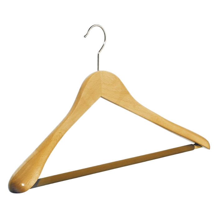 Kleiderbügel ECO 7209b natur ✓ Material buche Massivholz ✓ Kugelhaken 3,4 mm vernickelt ✓ der Haken ist 360° drehbar ✓ Kleiderbügel in gewinkelter Form ✓ die Bügelbreite beträgt 45 cm ✓ mit rutschfestem Hosensteg ✓ die Auflagebreite beträgt 45 mm