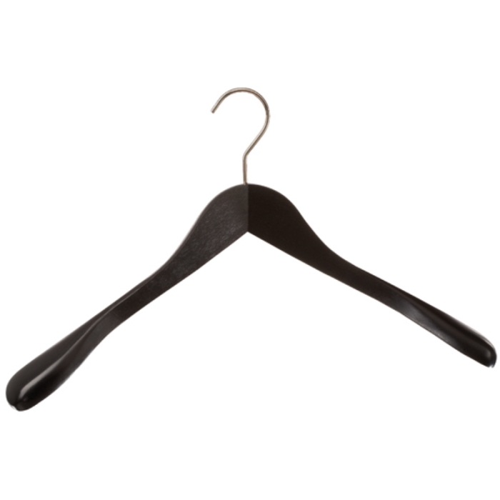 Kleiderbügel ECO 7210c schwarz ✓ Haken 4mm silber glänzend ✓ Kleiderbügel in gewinkelter Form ✓ aus Massivholz gefertigt, schwarz lackiert ✓ in weiß oder schwarz lackiert erhältlich ✓ erhältlich in einer Bügelbreite von 41 cm ✓ der Kleiderbügel hat eine Auflagebreite von 40 mm ✓ die Gesamthöhe des Bügels beträgt 25 cm