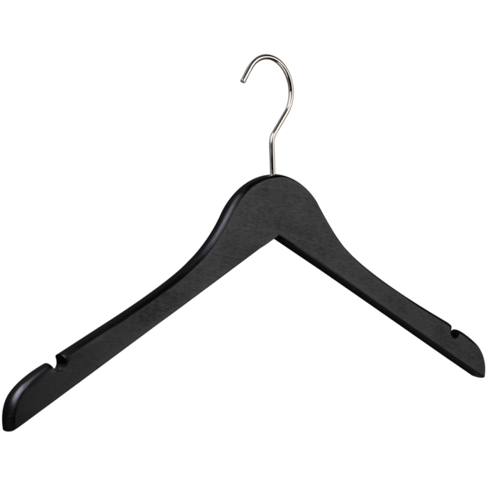 Der Kleiderbügel besteht aus hochwertigem Massivholz, das in elegantem Schwarz lackiert ist. Sie haben die Wahl zwischen einer Lackierung in Weiß oder Schwarz, je nach Ihrem persönlichen Geschmack. Mit einer Bügelbreite von 44 cm bietet dieser Kleiderbügel ausreichend Platz für Ihre Garderobe. Die beiden Rockeinkerbungen an den Seiten ermöglichen das sichere Aufhängen von Röcken oder Hosen.
