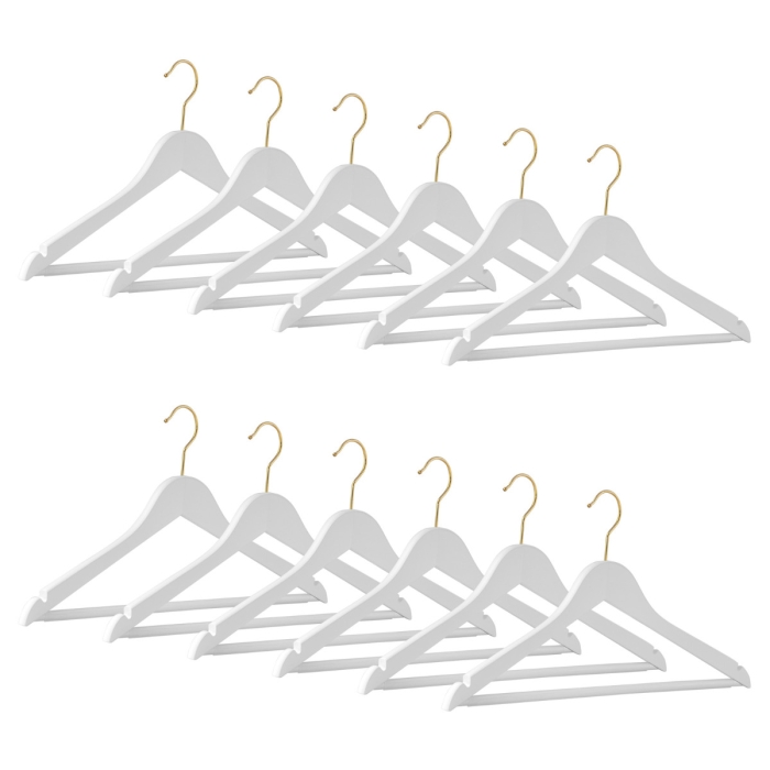 Der Kleiderbügel ECO Business RE RFS in edlem Weiß mit einem vermessingten Haken vereint stilvolles Design mit hoher Funktionalität. Unser 12er-Set dieser erstklassigen Bügel ist die ultimative Wahl für alle, die Wert auf Eleganz und Organisation legen