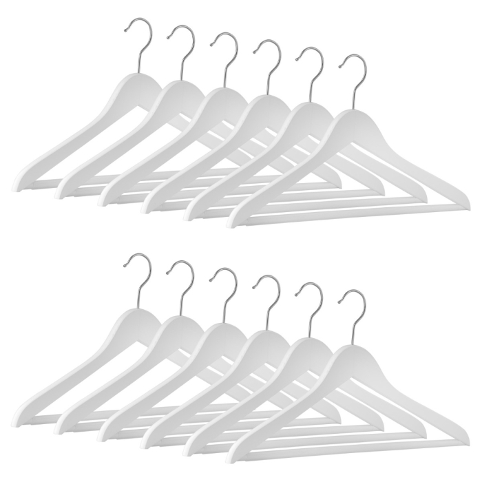 Das 12er Kleiderbügel Set ECO Business RFS in Weiß kombiniert Funktionalität und stilvolles Design. Die Formbügel aus hochwertigem Buchenholz haben eine gewinkelte Form und eine Auflagenbreite von 12 mm. Sie sind mit einem drehbaren 3,4 mm Haken aus vernickeltem Metall ausgestattet, der eine Hakenöffnung von 40 mm bietet. Die körpergerecht geformten Bügel verfügen über einen rutschfest ummantelten Hosensteg und sind in Weiß lackiert. Mit einer Breite von 44 cm und einem Gewicht von ca. 160 g pro Bügel eignen sie sich ideal für Mäntel, Jacken und Oberbekleidung.