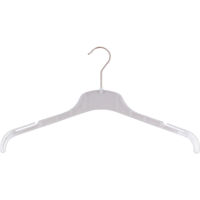 Der Kleiderbügel FO 1 in transparent mit einer Breite von 47 cm überzeugt durch sein schlichtes und funktionales Design. Die schmale Auflagebreite von 10 mm und die länglichen Rockkerben bieten sicheren Halt für Kleidungsstücke mit Trägern. Hergestellt aus robustem Kunststoff und ausgestattet mit einem verzinkten, drehbaren Haken, ist dieser Bügel sowohl langlebig als auch vielseitig einsetzbar. Produziert nach CCG-Richtlinien, ist er die ideale Wahl für Ihre Garderobe.