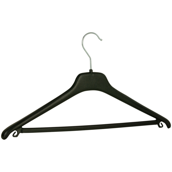 Kleiderbügel HL 245 schwarz ✓ Kunststoffbügel in schwarz ✓ Kleiderbügel leicht gewölbt ✓ verzinkter und drehbarer Haken ✓ die Auflagenbreite beträgt 17 mm ✓ erhältlich in einer Breite von 45 cm ✓ mit festem Steg und Rockhaken an den Seiten