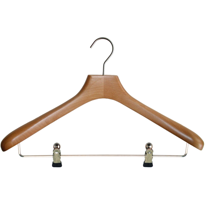 Kleiderbügel MAWA Exclusive K ✓ der Kleiderbügel ist körpergeformt ✓ mit verbreiterten Schulterenden ✓ die Hakenöffnung beträgt 43 mm ✓ die Auflagenbreite beträgt 45 mm ✓ in der Farbe Buche natur lackiert erhältlich ✓ drehbarer, pulverbeschichteter Haken ✓ aus Massivholz mit Klammerngestell ✓ erhältlich in den Breiten 41 cm und 45 cm ✓ Komfort-Formbügel mit Flachkopf-Kragenform ✓ die Gesamthöhe des Bügels beträgt 26,5 cm ✓ das Gewicht des Kleiderbügels beträgt ca. 388-418g ✓ gewalzter 4 mm Stahldraht mit zwei verschiebbaren Clips