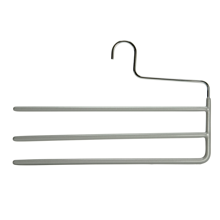 Der formschöne, dauerhaft glänzend verchromte Hosenbügel besteht aus 4,6 mm massivem Rundstahl und verfügt über eine Auflagenbreite von 7 mm. Der Hosenbügel besitzt drei rutschhemmend ummantelte Stege und ist erhältlich in den Farben schwarz, dunkelblau und silber. Die Kleiderbügelbreite beträgt 35 cm. Der Kleiderbügel eignet sich für Hosen aller Art und Länge sowie Tücher und Schals. Kleiderbügel-Spitzenqualität "Made in Germany"
