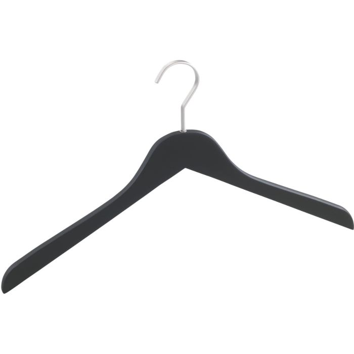 Der optimale Aufhänger für alle Kleidungsstücke: Der Garderobenbügel Typ Paris ist ideal für die Aufbewahrung von Mänteln, Jacken, Sakkos, T-Shirts, Hemden, Blusen, Kostümen und Röcken. Mit einer Breite von 44 cm gibt er allen Kleidungsstücken besonders guten Halt. Die Schulterauflage ist zudem rutschhemmend gummiert. Der hochwertige Bügel in massiver Ausführung ist aus Holz gefertigt und in mattiertem schwarz lackiert.
