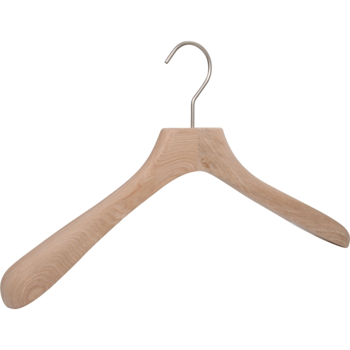 Unbehandeltes Eschenholz, das sorgfältig fein geschliffen wurde, verleiht diesem Kleiderbügel seinen charakteristischen Look. Seine gebogene Kleiderbügelform präsentiert sich elegant und geschwungen. Er ist in den Bügelbreiten von 41 cm und 45 cm erhältlich und bietet großzügigen Platz, um Ihre Garderobe stilvoll zu organisieren. Die außergewöhnliche Auflagebreite von etwa 40 mm gewährleistet, dass Ihre Kleidung sicher aufgehoben ist, ohne dabei Druckstellen zu hinterlassen.