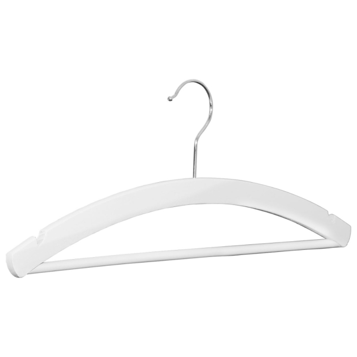 Kleiderbügel Standard RES weiß ✓ mit abgesenkten Enden ✓ die Hakenöffnung beträgt 42 mm ✓ drehbarer Haken, vernickelt ✓ Kleiderbügel ist plangeformt ✓ mit Rockkerben an den Seiten ✓ in der Farbe weiß lackiert ✓ Kombi-Flachbügel aus Massivholz ✓ die Bügelbreite beträgt 42 cm ✓ die Auflagenbreite beträgt 8 mm ✓ das Gewicht des Kleiderbügels beträgt ca. 76 g ✓ Kombi-Flachbügel aus Massivholz mit Holzsteg